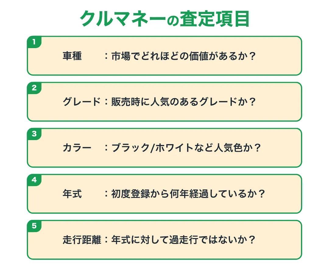とりわけ重要な査定項目は「①車種」「④年式」「⑤走行距離」と推察できます。これらは中古車の査定額に最も影響する項目であり、クルマネーでもこの3つの査定項目を中心に買取金額を決めていることでしょう。